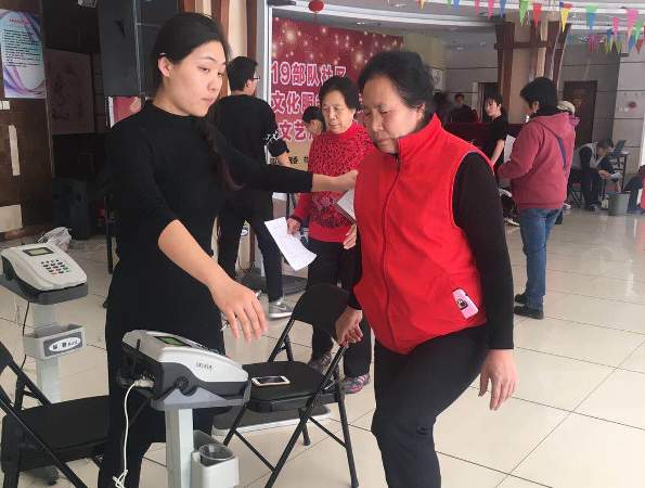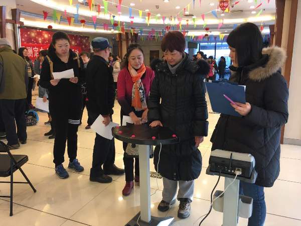 本次测试的对象为马连洼街道各个健身团队和社区居民,内容包括国民体质11项测定(具体包括身高、体重、握力、纵跳、俯卧撑、仰卧起坐、坐位体前屈、闭眼单脚站立、肺活量、台阶测试)和骨密度测试。本次测试以中老年群体为主,这要求在测试过程中既要保证测试数据的真实准确,又要保证参测人员的安全。经过两天的测试,海淀区全民健身科学指导中心测试团队的工作态度和热情得到了街道和居民的一致好评。