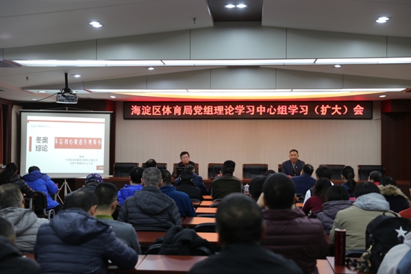 11月30日,海淀区体育局召开党组理论学习中心组学习(扩大)会。局党组成员、局长助理陈滔、局副主任科员以上干部、在职全体党员、机关离退休党支部委员、事业单位退休党支部委员参加了本次会议。会议特别邀请了中国经济体制改革委员会副会长、京张冬奥研究中心主任陈剑教授作了“深入学习贯彻十九大精神,奋力推动体育事业发展”的主题宣讲。局党组书记崔仲军主持会议。